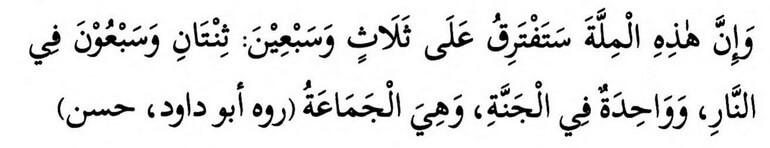 Slogan ini juga didasarkan pada hadis riwayat al-Tirmidzi sebagaimana telah disebut di atas ("Man arada bihubuhat al-jannah..."), juga hadis riwayat Abu Dawud tentang terpecahnya agama ini menjadi 73 golongan, yaitu: