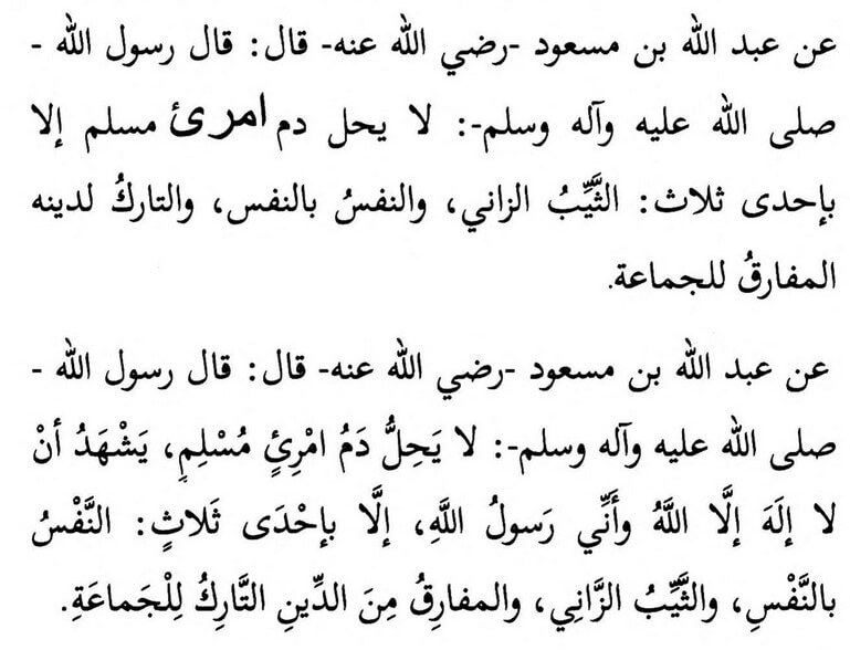 “Tidak halal darah seorang muslim yang masih bersaksi tidak ada sesembahan yang benar selain Allah, kecuali sebab salah satu dari tiga perkara: duda/janda yang berzina, seseorang dibunuh karena membunuh orang lain, dan orang yang meninggalkan agamanya, yakni memisahi Al-Jama'ah.”