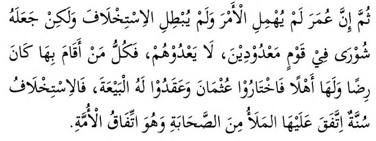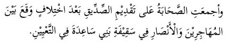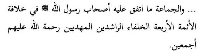 "Sedangkan al-jamaah adalah segala sesuatu yang telah disepakati oleh para sahabat Rasul SAW pada masa Khulafa'ur Rasyidin (Abu Bakar, 'Umar, Utsman, dan 'Ali) yang telah diberi hidayah (mudah-mudahan Allah memberi rahmat kepada mereka semua)."