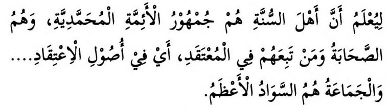 "Hendaklah diketahui bahwa Ahlus Sunnah adalah mayoritas umat Nabi Muhammad. Mereka adalah para sahabat dan golongan yang mengikuti mereka dalam prinsip-prinsip akidah.... Sedangkan al-jama'ah adalah mayoritas terbesar (al-sawad al-a'zham) kaum Muslimin."
