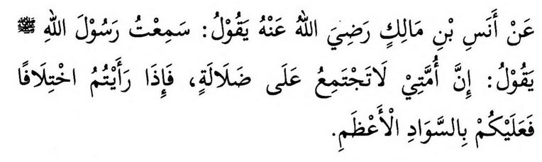 "Dari Anas bin Malik r.a. berkata: "Aku mendengar Rasulullah SAW bersabda: 'Sesungguhnya umatku tidak akan bersepakat pada kesesatan. Oleh karena itu, apabila kalian melihat terjadinya perselisihan, maka ikutilah kelompok mayoritas (al-sawad al-a'zham)'."