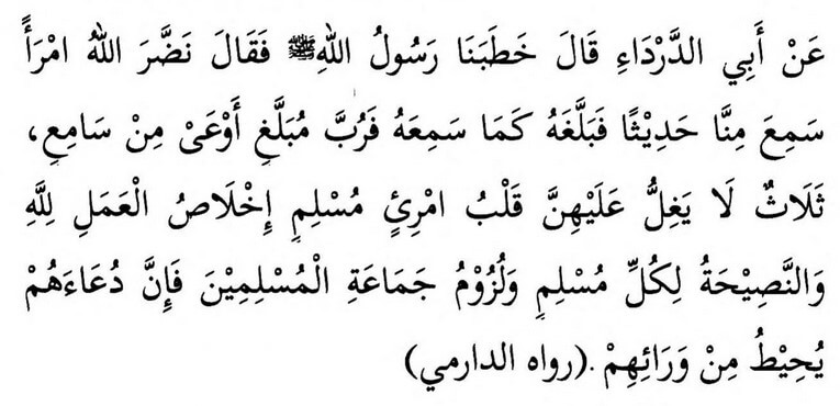 "... Dari Abu Darda' ia berkata: 'Rasulullah SAW berkhutbah: 'Allah SWT menerangi seseorang yang mendengar suatu hadis dari kami kemudian menyampaikannya sebagaimana ia mendengarnya, karena banyak orang yang menyampaikan itu lebih mengena (membekas) daripada orang yang mendengar (semata). Tiga perkara yang dapat membersihkan hati seorang muslim (dalam riwayat lain: mukmin) dari sifat dendam dan keje]ekan, yaitu ikhlas beramal kepada Allah, menasehati pada setiap orang Muslim (dalam riwayat lain: pada ulil amri/penguasa), dan selalu mengikuti mayoritas kaum muslimin, karena doa mereka akan selalu mengikutinya'." (HR. al-Darimi)