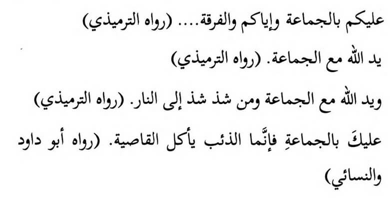 "Tetaplah kamu dengan berjamaah, karena sungguh serigala itu memakan gembala yang jauh dan memisahkan diri dari kelompoknya" (HR. Abu Dawud dan al-Nasa'i dari Abu Darda', dengan sedikit perbedaan redaksi).