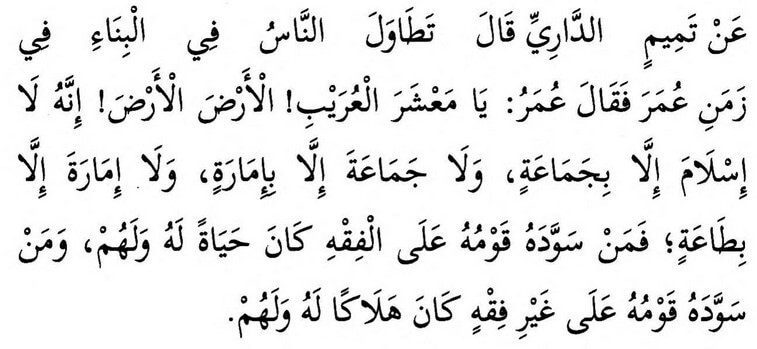 "Diriwayatkan dari Tamim Ad-Dari bahwa di masa 'Umar bin Khatab orang-orang berlomba membuat bangunan yang tinggi. Melihat itu umar berkata: 'Wahai penduduk Uraib (sebuah klan di Yaman), bumi-bumi (rendahkan bangunan kamu ke bumi). Sungguh tidak sempurna Islam kecuali dengan Jamaah, Tidak akan ada Jamaah tanpa adanya kepemimpinan, Tidak ada kepemimpinan tanpa ketaatan. Siapa pun yang diangkat menjadi pemimpin oleh kaumnya atas dasar kefaqihannya (pemahaman agama secara mendalam), maka pasti hal itu akan menjadi kehidupan bagi dirinya dan bagi mereka'." (HR. al-Darimi) Dalam kitab syarah Sunan al-Darimi, berjudul Fath al-Mannan Syarh, wa-Tahqiq karya al-Sayid Abu 'Ashim Nabil bin Hasyim al-Ghamiri,8 dalam Kitab al-'Ilm, hadis nomor 265.