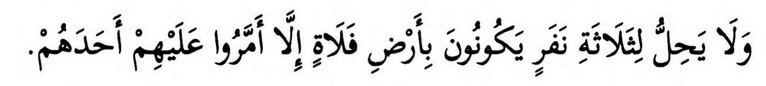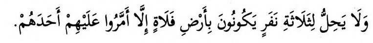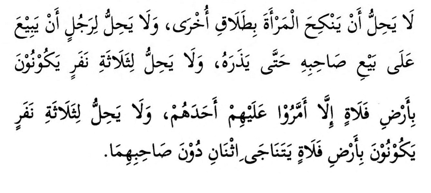 “Tidak halal seorang laki-laki menikahi perempuan dengan syarat menceraikan perempuan yang lain, tidak halal seorang laki-laki berjual beli mengalahkan jual beli saudaranya sampai dia meninggalkannya, tidak halal bagi tiga orang yang berada di suatu gurun (sedang bepergian jauh) kecuali mereka menjadikan salah satu mereka sebagai amir mereka (pimpinan selama perjalanan): dan tidak halal bagi tiga orang yang sedang berada di suatu gurun (sedang bepergian jauh) dua orang dari mereka berbisik-bisik dengan meninggalkan yang lain.”