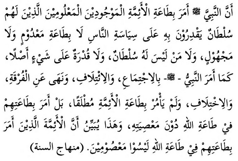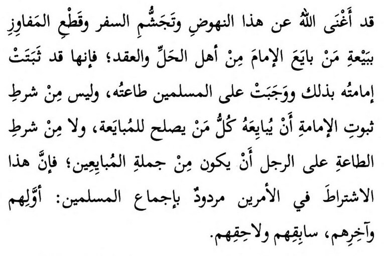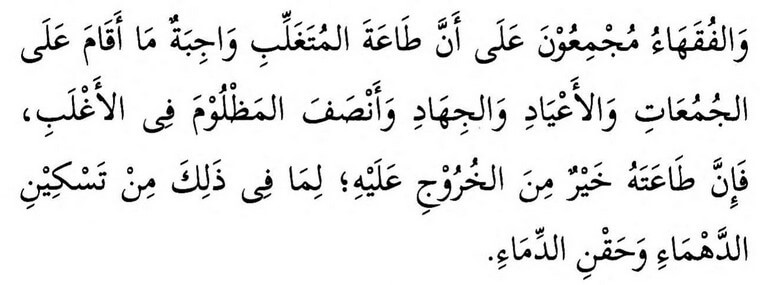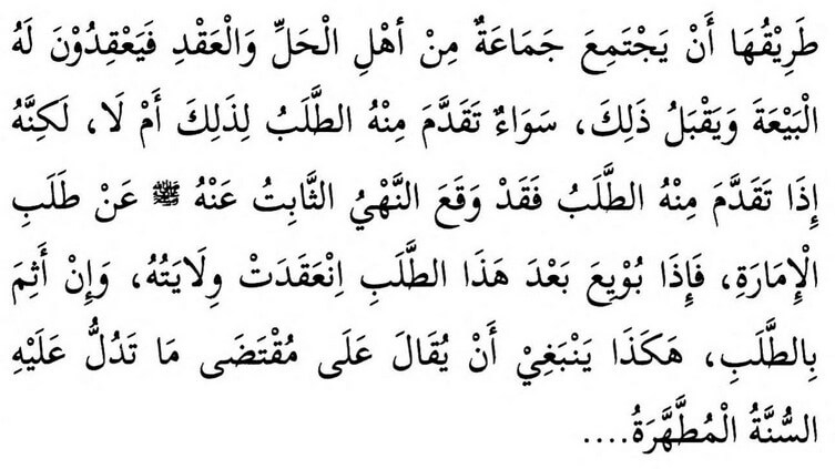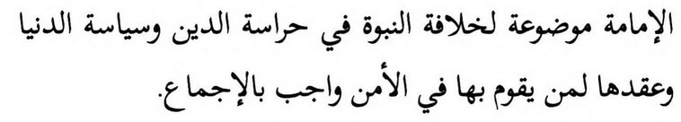 “Keimaman diadakan dalam rangka menggantikan tugas kenabian berupa menjaga agama dan mengatur urusan duniawi. Memberikan jabatan ini kepada orang yang bisa melaksanakan di kalangan umat Islam ini hukumnya adalah wajib berdasarkan ijma' (kesepakatan ulama).”