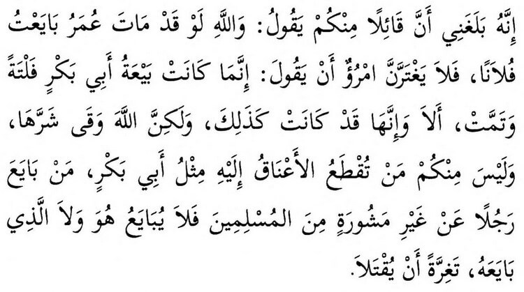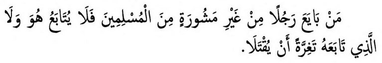 “Barangsiapa membai'at seseorang tanpa musyawarah dari kaum muslimin maka ia tidak boleh diikuti, dan tidak pula mengikuti para pendukungnya, karena khawatir mereka akan dibunuh (yang berbai'at dan yang dibai'at).” (HR. al-Bukhari)