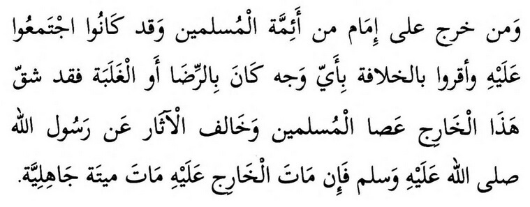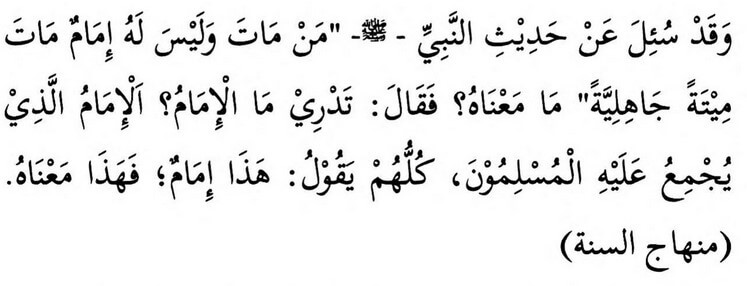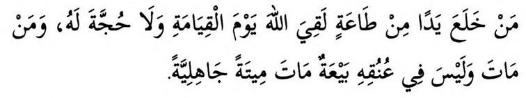 “Barangsiapa mencabut tangan dari ketaatan maka dia bertemu Allah dengan tidak ada hujjah baginya dan barang siapa mati dalam keadaan tidak ada baiat di lehernya maka dia mati seperti matinya orang jahiliyah.”
