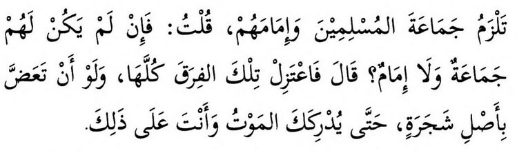 “Engkau selalu bersama jama'atul muslimin dan imam mereka. Hudzaifah berkata, “Bila tidak ada jama'atul muslimin dan imamnya?” Rasulullah bersabda: “Jauhilah semua firqah (kelompok-kelompok) itu sekalipun engkau harus menggigit akar pohon, sampai maut menjumpaimu dan engkau dalam keadaan seperti itu.”