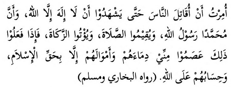 “Aku diperintahkan untuk memerangi manusia sampai mereka bersaksi bahwa tidak ada sesembahan kecuali Allah dan bahwa Muhammad adalah utusan Allah, mereka menegakkan shalat dan menunaikan zakat. Maka apabila mereka telah melakukan itu, maka mereka telah melindungi darah dan harta mereka dariku kecuali dengan hak Islam, dan perhitungan mereka ada pada Allah.” (HR. al-Bukhari dan Muslim)