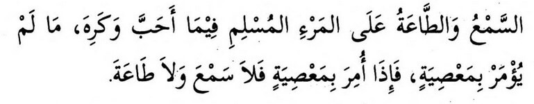 “Wajib bagi seorang muslim mendengarkan dan taat dalam perintah yang dia senangi dan dia benci selagi dia tidak diperintah dengan maksiat, jika dia diperintah dengan maksiat maka tidak boleh mendengar dan tidak boleh taat.”