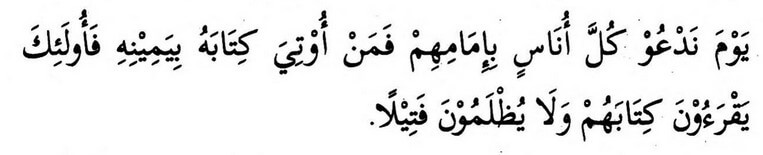 “(Ingatlah) pada hari Aku memanggil setiap manusia beserta imam mereka, lalu barang siapa diberi buku amalnya dengan tangan kanannya maka mereka membaca buku amal mereka dan tidak dianiaya seselaput kurma pun.”