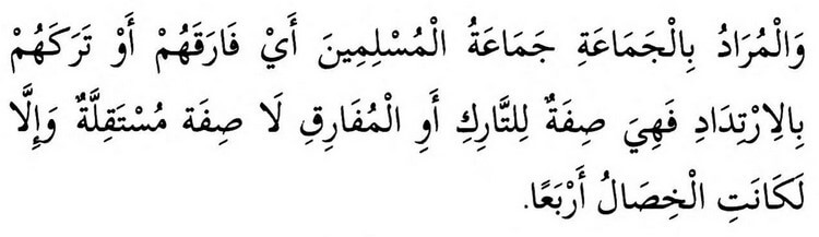“Maksud dari al-jama'ah (dalam hadis tersebut) adalah jamaatul muslimin. Maksudnya, dia memisahi al-jamaah atau meninggalkannya dengan kembali kepada kekafiran (murtad), maka lafadz (yang memisahi al-Jamaah) adalah sifat bagi kalimat (yang meninggalkan agamanya) atau (yang memisahi agamanya), bukan sifat yang berdiri sendiri, jika tidak maka perkara (yang menghalalkan darah itu) ada empat.”