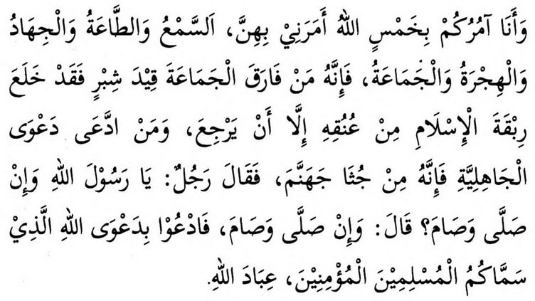 “Dan aku perintahkan kalian dengan lima perkara, yaitu mendengar, taat, jihad, hijrah, dan berjamaah. Sesungguhnya barangsiapa memisahi al-Jama'ah kira-kira satu jengkal, maka sungguh dia telah melepas tali Islam dari lehernya kecuali dia kembali. Dan barangsiapa memanggil dengan panggilan jahiliyah, maka dia termasuk tumpukan batu Jahannam. Maka seorang laki-laki berkata: “Wahai Rasulullah dan meskipun dia shalat dan puasa?” Beliau bersabda, 'Dan meskipun dia shalat dan puasa. Maka panggillah dengan nama yang Allah berikan untuk kalian, yaitu “orang-orang iman, orang-orang Islam.”