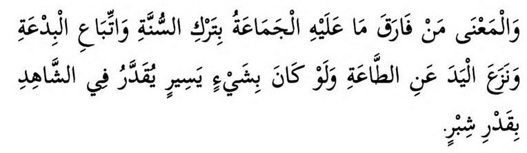 “Dan maknanya adalah, barang siapa memisahi apa yang ditetapi oleh Al-Jama'ah dengan meninggalkan sunnah dan mengikuti bid'ah dan mencabut tangan dari ketaatan walaupun dengan sesuatu yang sedikit yang bisa dikira-kira satu jengkal bila itu benda yang bisa dilihat.”