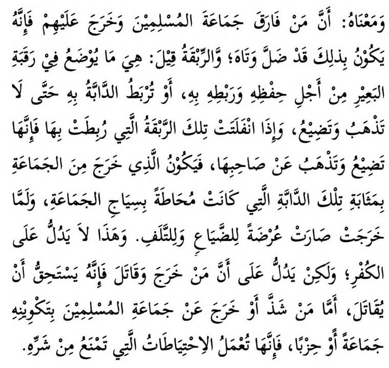 Dan maknanya adalah: barang siapa memisahi jamaatul muslimin dan menentangnya, maka dengan itu dia telah tersesat dan bingung. Adapun makna (...) dikatakan: bahwa ia adalah tali yang diletakkan di leher unta untuk menjaga dan mengikatnya, atau tali untuk mengikat hewan sehingga tidak pergi dan tidak hilang, bila tali yang mengikatnya itu lepas, maka ia akan hilang dan pergi dari pemiliknya. Maka orang yang keluar dari al-jamaah seperti halnya hewan sebelumnya dijaga dengan pagar al-Jamaah dan ketika dia telah keluar, maka dia rawan tersia-sia dan rusak. Dan ini tidak menunjukkan kekafiran akan tetapi menunjukkan bahwa orang keluar dan memerangi al-jamaah, maka dia berhak diperangi adapun orang yang keluar dari jama'atul muslimin dengan membuat suatu kelompok atau golongan, maka yang dilakukan (oleh jama'tul muslimin) adalah tindakan antisipasi yang mencegah keburukannya.”