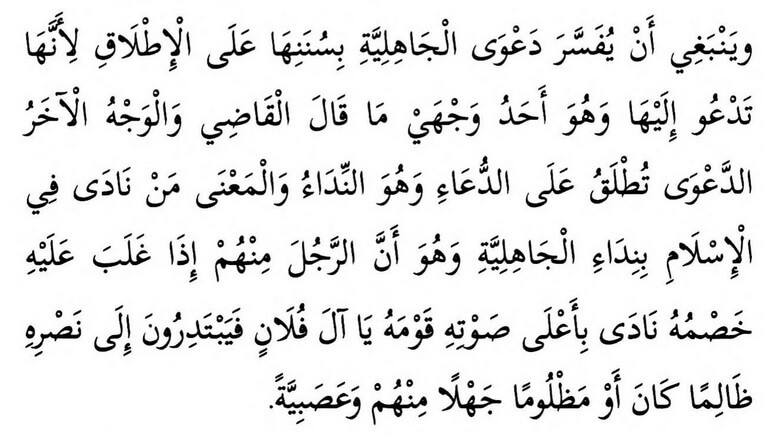 “Seharusnya ajakan jahiliyah (dalam hadis ini) diartikan dengan semua kebiasaan jahiliyah karena orang-orang mengajak kepada kebiasaan itu. Dan ini adalah salah satu dari dua penafsiran Al-Gadhi. Adapun penafsiran yang lain kalimat (...) juga digunakan untuk makna (...) yaitu panggilan dan artinya adalah orang yang memanggil di dalam Islam dengan panggilan-panggilan jahiliyah. (Adapun kebiasaan orang jahiliyah) adalah, bila ada seseorang dari mereka dikalahkan oleh lawannya, maka dia akan memanggil kaumnya dengan suara paling keras “wahai keluarga fulan”, maka mereka akan segera menolongnya, baik dia dalam keadaan menganiaya maupun dianiaya, itu karena kebodohan dan semangat kegolongan mereka.”