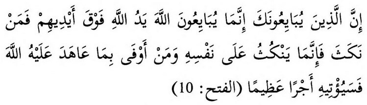 “Bahwasanya orang-orang yang berjanji setia kepadamu (Muhammad), sesungguhnya mereka hanya berjanji setia kepada Allah. Tangan Allah di atas tangan mereka, maka barangsiapa melanggar janji, maka sesungguhnya dia melanggar atas (janji) sendiri, dan barangsiapa menepati janjinya kepada Allah maka Dia akan memberinya pahala yang besar.” (QS. al-Fath (48): 10).