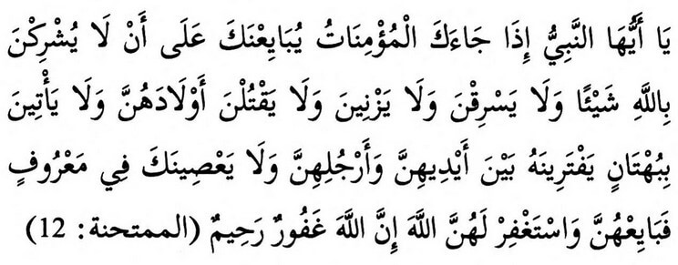 “Wahai Nabi! Apabila perempuan-perempuan yang mukmin datang kepadamu untuk mengadakan bai'at (janji setia), bahwa mereka tidak akan mempersekutukan sesuatu apa pun dengan Allah, tidak akan mencuri, tidak akan berzina, tidak akan membunuh anak-anaknya, tidak akan berbuat dusta yang mereka ada-adakan antara tangan dan kaki mereka dan tidak akan mendurhakaimu dalam urusan yang baik, maka terimalah janji setia mereka dan mohonkanlah ampunan untuk mereka kepada Allah. Sungguh, Allah Maha Pengampun, Maha Penyayang.” (OS. al-Mumtahanah (60): 12)