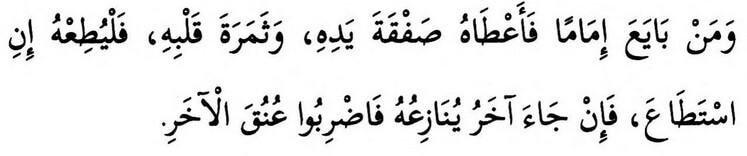 “Siapa yang membai'at seorang imam lalu kemudian meletakkan tangannya (sebagai bukti bai'at) dan ketulusan hatinya. Dia harus mematuhinya dengan kemampuan terbaiknya. Jika orang lain maju (sebagai pengklaim Khilafah), memperdebatkan otoritasnya, mereka (Muslim) harus memenggal kepala yang terakhir.” (HR. Muslim)