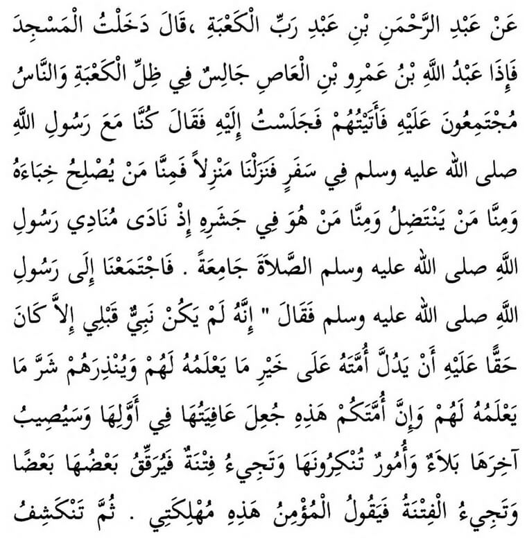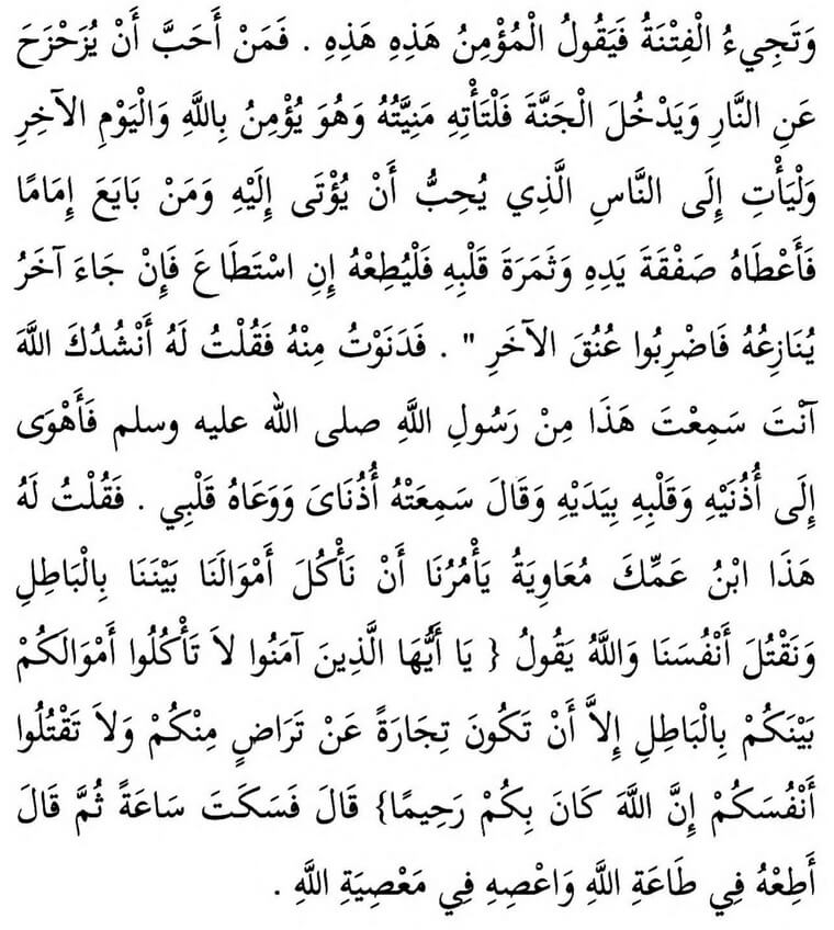 "Dari Abdurrahman bin Abdul Rabbilka'bah berkata: Saya memasuki masjid ketika 'Abdullah bin 'Amr bin al-'As sedang duduk di bawah naungan Ka'bah dan orang-orang telah berkumpul di sekelilingnya. Saya menghampiri mereka dan duduk di dekatnya. Kemudian Abdullah berkata: Saya menemani Rasulullah dalam perjalanan. Kami berhenti di suatu tempat. Beberapa dari kami mulai mendirikan tenda mereka, yang lain mulai bersaing satu sama lain dalam menembak, dan yang lain mulai menggembalakan binatang mereka, ketika seorang Muadzin Rasulullah adzan, kami kemudian berkumpul di sekitar Rasulullah. Dia berkata: Adalah kewajiban setiap Nabi yang telah pergi sebelum saya untuk membimbing para pengikutnya kepada apa yang dia tahu baik bagi mereka dan memperingatkan mereka terhadap apa yang dia tahu buruk bagi mereka, tapi Ummatmu ini memiliki hari-hari kedamaian dan (keamanan) di awal keberadaannya, dan pada fase terakhir keberadaannya akan ditimpa cobaan dan hal-hal yang tidak menyenangkan bagimu. (Dalam fase Umat ini), akan ada cobaan yang luar biasa satu demi satu, masing-masing membuat yang sebelumnya menyusut menjadi tidak berarti. Ketika mereka ditimpa cobaan, orang mu'min akan berkata: Ini akan membawa kehancuranku. Setelah (pencobaan) selesai, mereka akan ditimpa cobaan yang lain, dan orang mu'min akan berkata: Ini pasti kesudahanku. Barang siapa yang ingin dibebaskan dari neraka dan masuk ke dalam surga harus mati dengan iman kepada Allah dan hari akhir dan memperlakukan manusia sebagaimana dia ingin diperlakukan oleh mereka. Dia yang bersumpah setia kepada seorang Khalifah lalu ia memberikan tangannya dan ketulusan hatinya (yaitu tunduk kepadanya baik lahiriah maupun batiniah), Dia harus mematuhinya dengan kemampuan terbaiknya. Jika orang lain maju (sebagai pengklaim Khilafah), memperdebatkan otoritasnya, mereka (Muslim) harus memenggal kepala yang terakhir. Perawi berkata: Saya mendekatinya (“Abdullah bin 'Amr bin al-'As) dan berkata kepadanya: Dapatkah anda bersumpah bahwa anda mendengarnya dari Rasulullah? Dia menunjuk dengan tangannya ke telinga dan hatinya dan berkata: Telingaku mendengarnya dan pikiranku menyimpannya. Aku berkata kepadanya: Sepupumu ini, Mu'awiyah, memerintahkan kami untuk memakan harta kami secara tidak adil di antara kami sendiri dan saling membunuh, sedangkan Allah berfirman: "Hai orang-orang yang beriman, janganlah kamu memakan hartamu di antara kamu secara tidak adil, kecuali jika berdaganglah berdasarkan kesepakatan bersama, dan janganlah kamu membunuh dirimu sendiri. Sesungguhnya Allah Maha Penyayang kepadamu” (OS. al-Nisa: 29). Perawi mengatakan bahwa (mendengar ini) Abdullah bin 'Amr bin al-As terdiam beberapa saat dan kemudian berkata: Taatilah dia sejauh dia taat kepada Allah, dan janganlah mentaatinya dalam hal-hal yang menyangkut kemaksiatan kepada Allah.” (HR. Muslim)